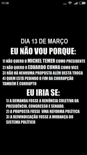 Este cartaz que está circulando pelos “Whatsapps” expressa bem o porque destas manifestações que acontecem pelo país, não expressarem a opinião de uma grande parcela da população. Elas retratam um determinado seguimento social. Na realidade, a maioria da população brasileira quer muito mais pelo país não apenas mudar um governo por outro que, se duvidar ainda vai colaborar para gerar ainda mais instabilidades.